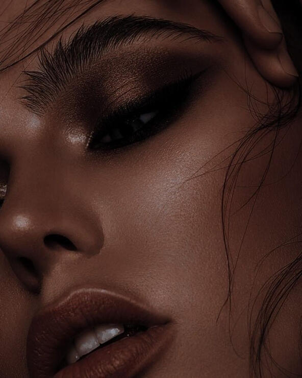 COSMETICS. A blend of deep, natural or smokey hues. Her signature lipstick colors are maroon or reddish brown.