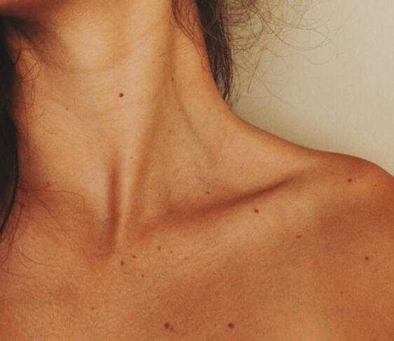 MARKINGS. Little moles appear all over her body with light dustings of barely-there freckles here and there. Her most prominent ones are a beauty mark just beneath her lower lip and two beneath one eye.